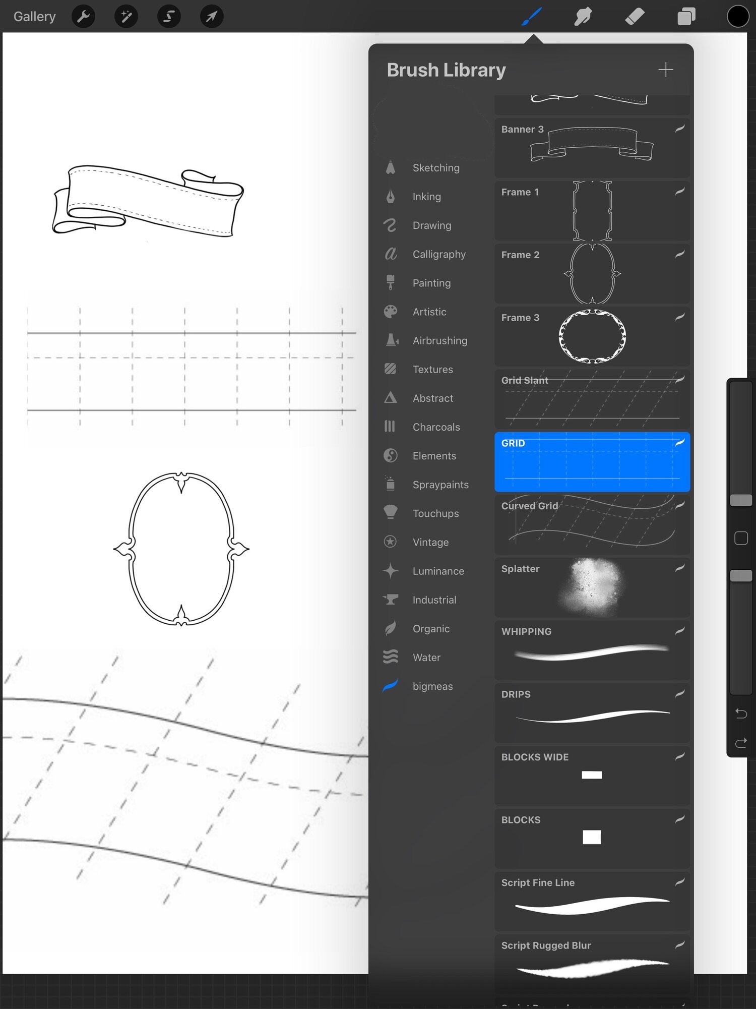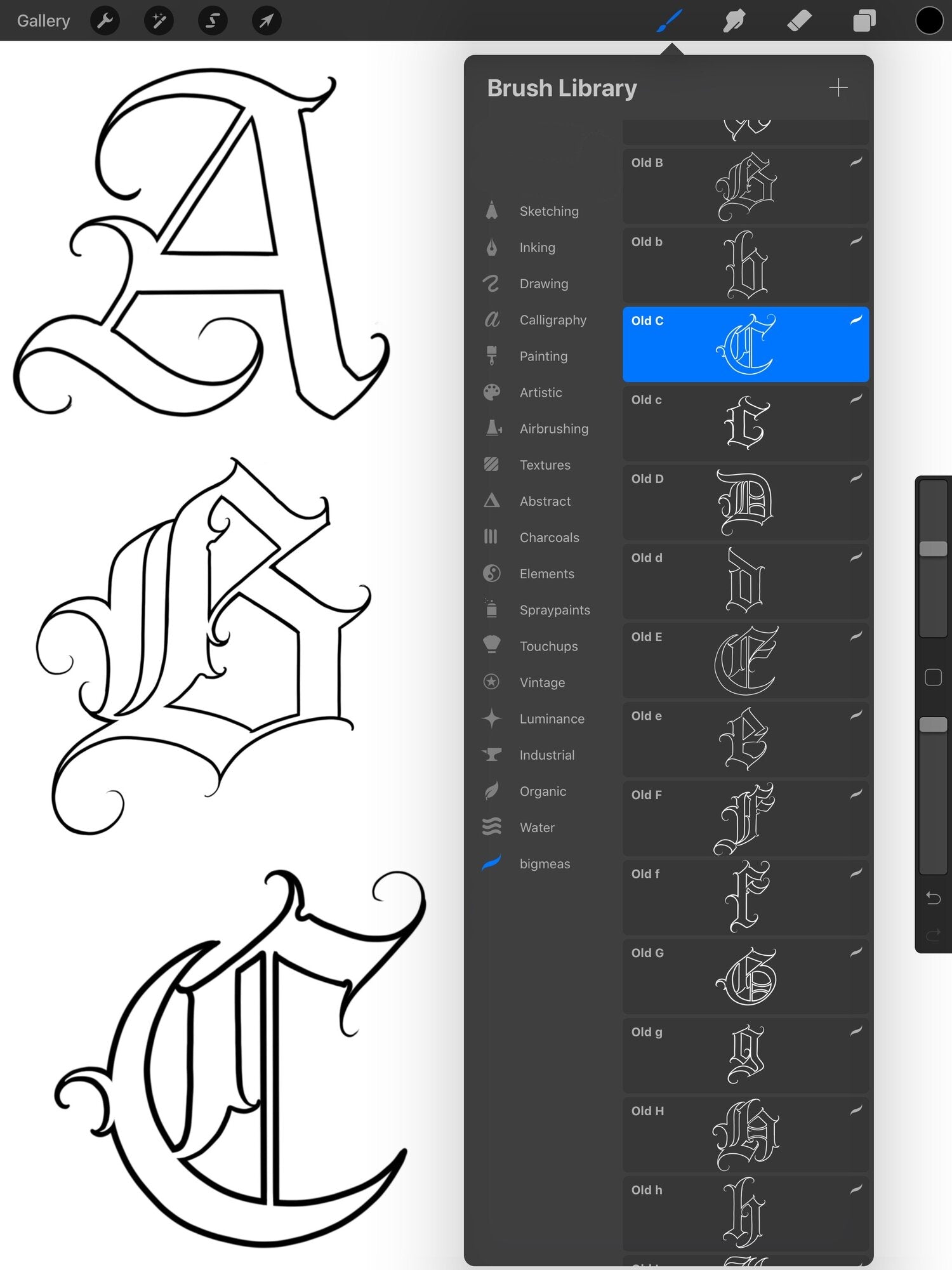 This brush set was handmade by me for the Procreate app on the iPad PRO. It features 89 brushes designed and micro-tuned to resemble the way my favorite writing tools work in real life. The set includes: brushes, stamps of the entire alphabet in Old English, lettering grids to help with spacing, various flourishes, and other shapes I love to use regularly in my day to day tattooing.